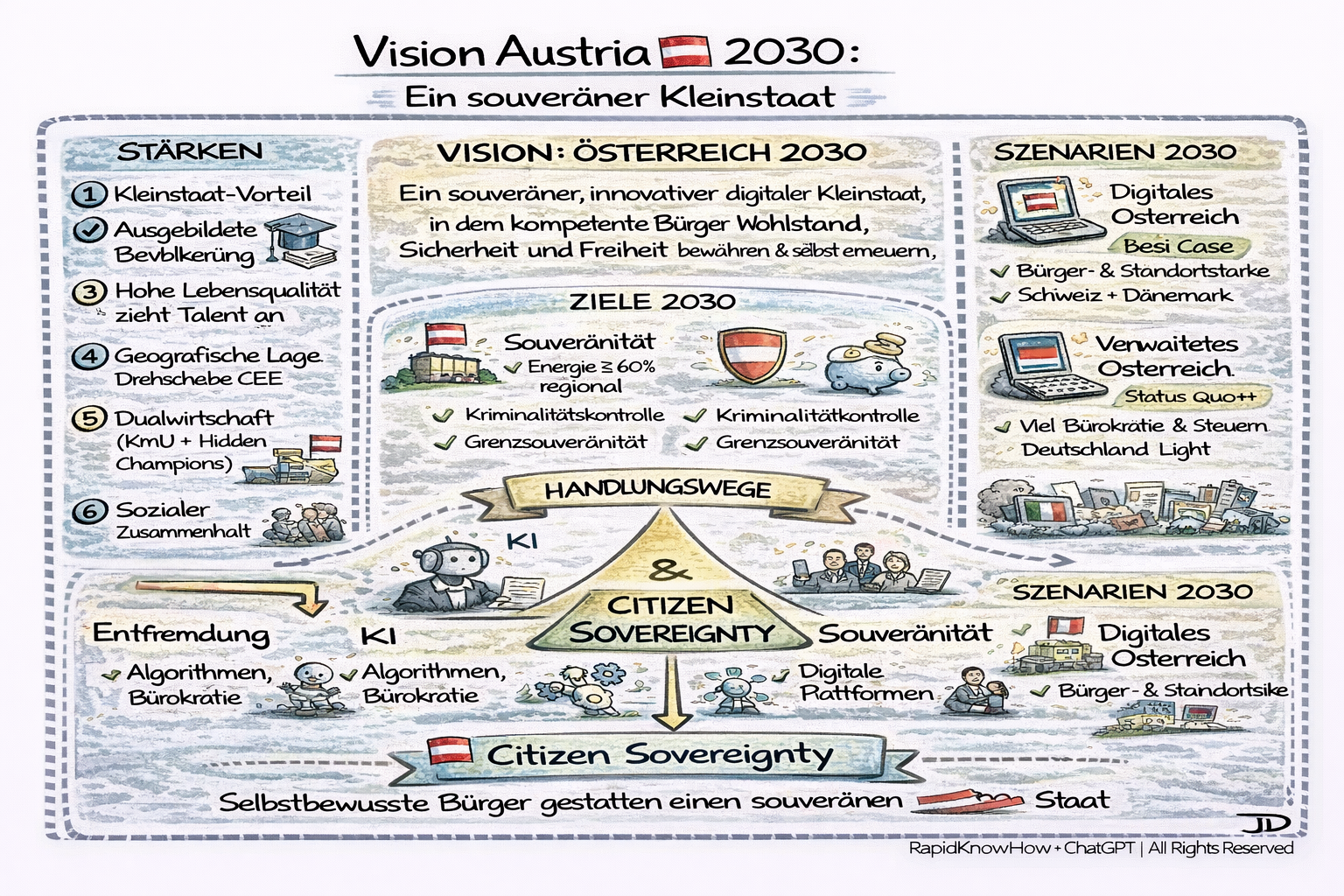 Österreich 2030 wird ein souveräner Kleinstaat, wenn Bürger handeln, Systeme modern reagieren und KI das aus dem Weg räumt, was Jahrzehnte blockiert hat.