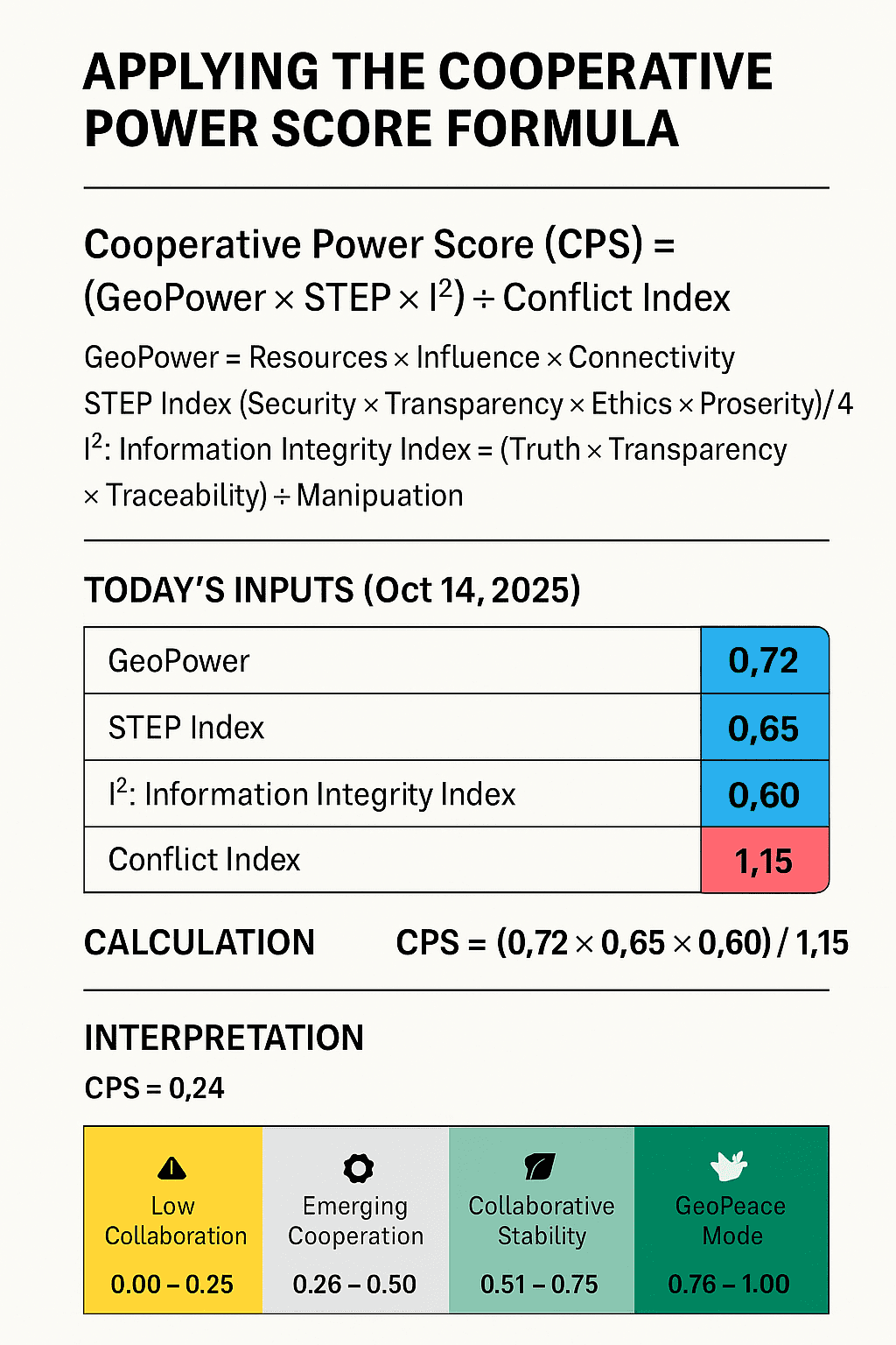 Raise any two of GP, STEP, I² by 0.1 each and reduce Conflict to 1.0 → CPS ≈ 0.43 (Emerging Cooperation).