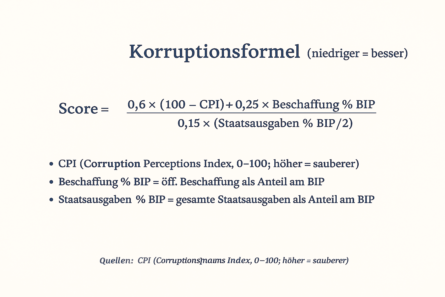 - Gewichtung 15 %: Geringer als CPI oder Beschaffung, weil hohe Ausgaben nicht automatisch Korruption bedeuten, aber Risiko vergrößern.