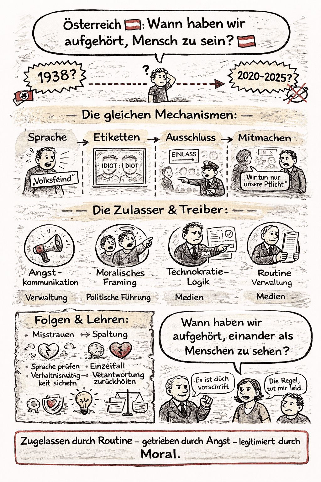 Kernaussage: Entmenschlichung beginnt nicht mit Gewalt, sondern mit Sprache, Etiketten und Routine. In Krisen werden moralische Abkürzungen akzeptiert, Verantwortung delegiert und Ausgrenzung normalisiert. Die Lehre aus der Geschichte ist keine Gleichsetzung – sondern eine Warnung vor wiederkehrenden Mechanismen.