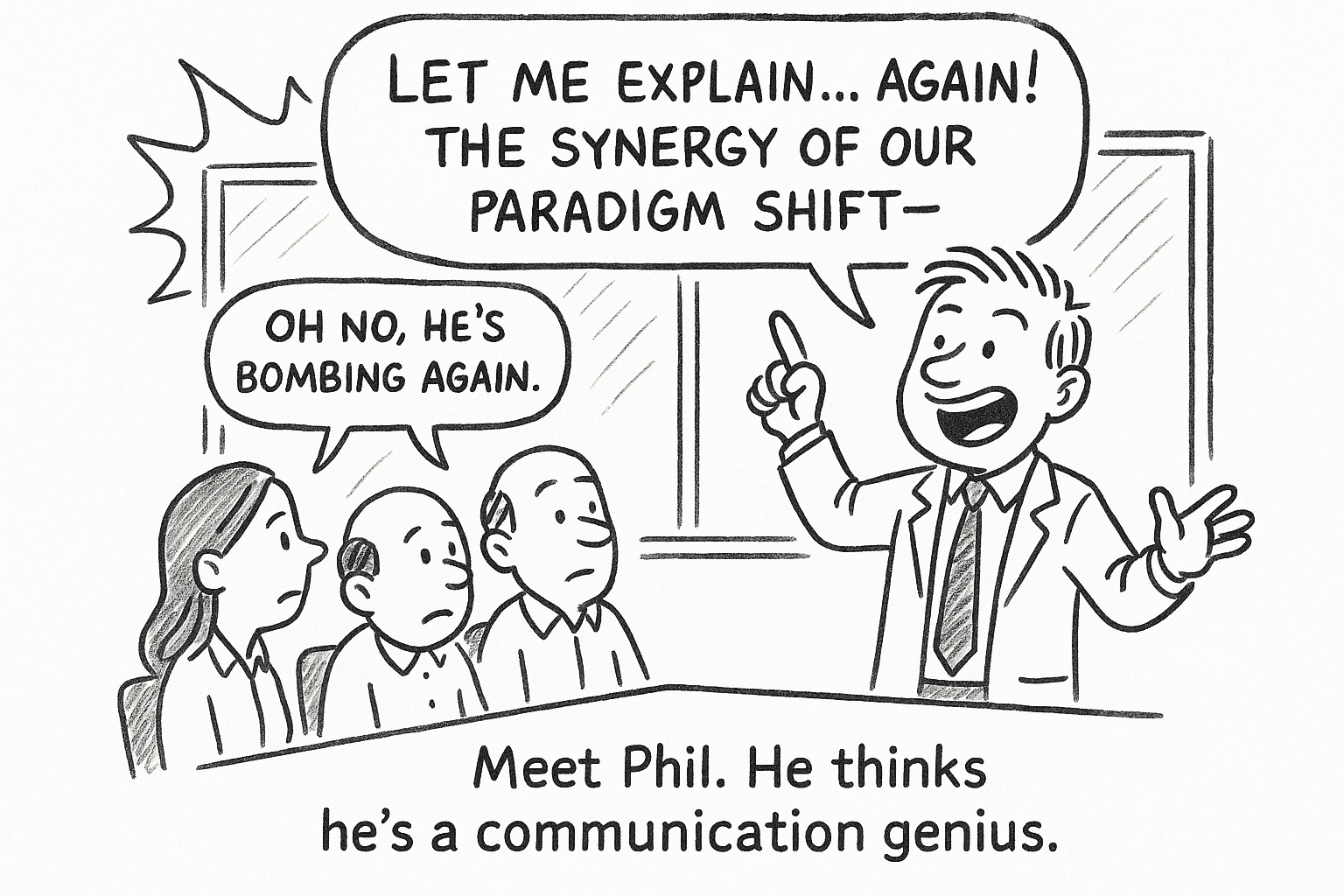 Office meeting explodes with Phil’s buzzwords. Colleagues look dazed.