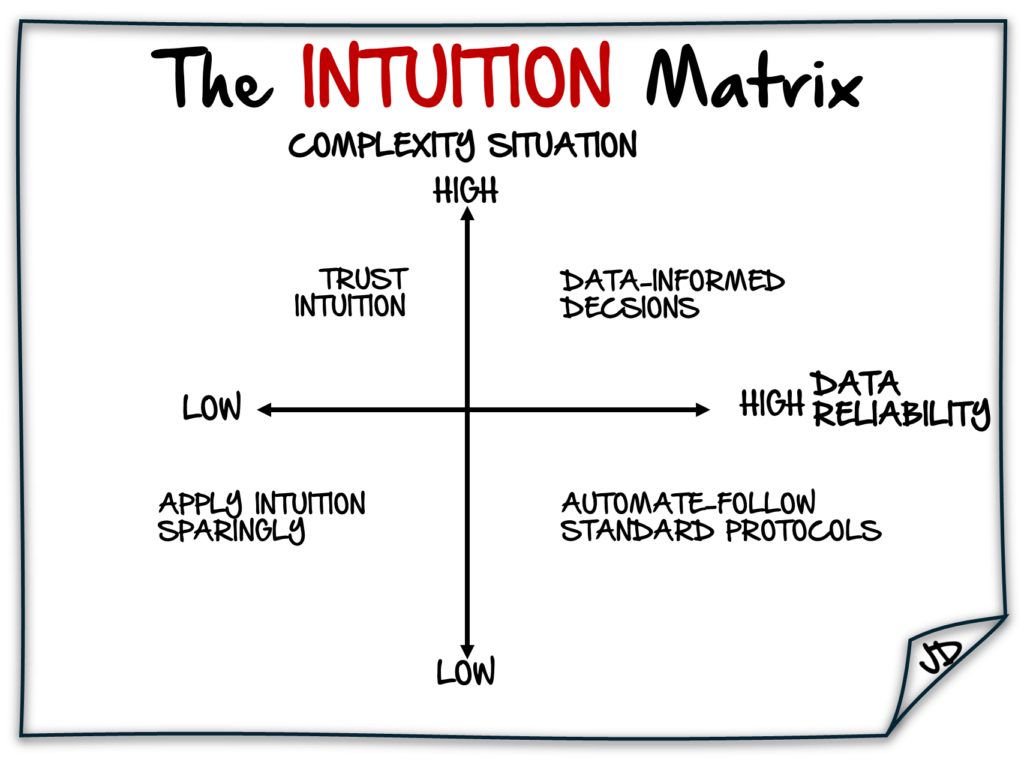 The Intuition-Data Matrix is a framework that helps leaders determine when to rely on intuition, data, or a balance of both, depending on the complexity of the situation and the availability of reliable information. It’s particularly useful for decision-making in uncertain or high-pressure environments.