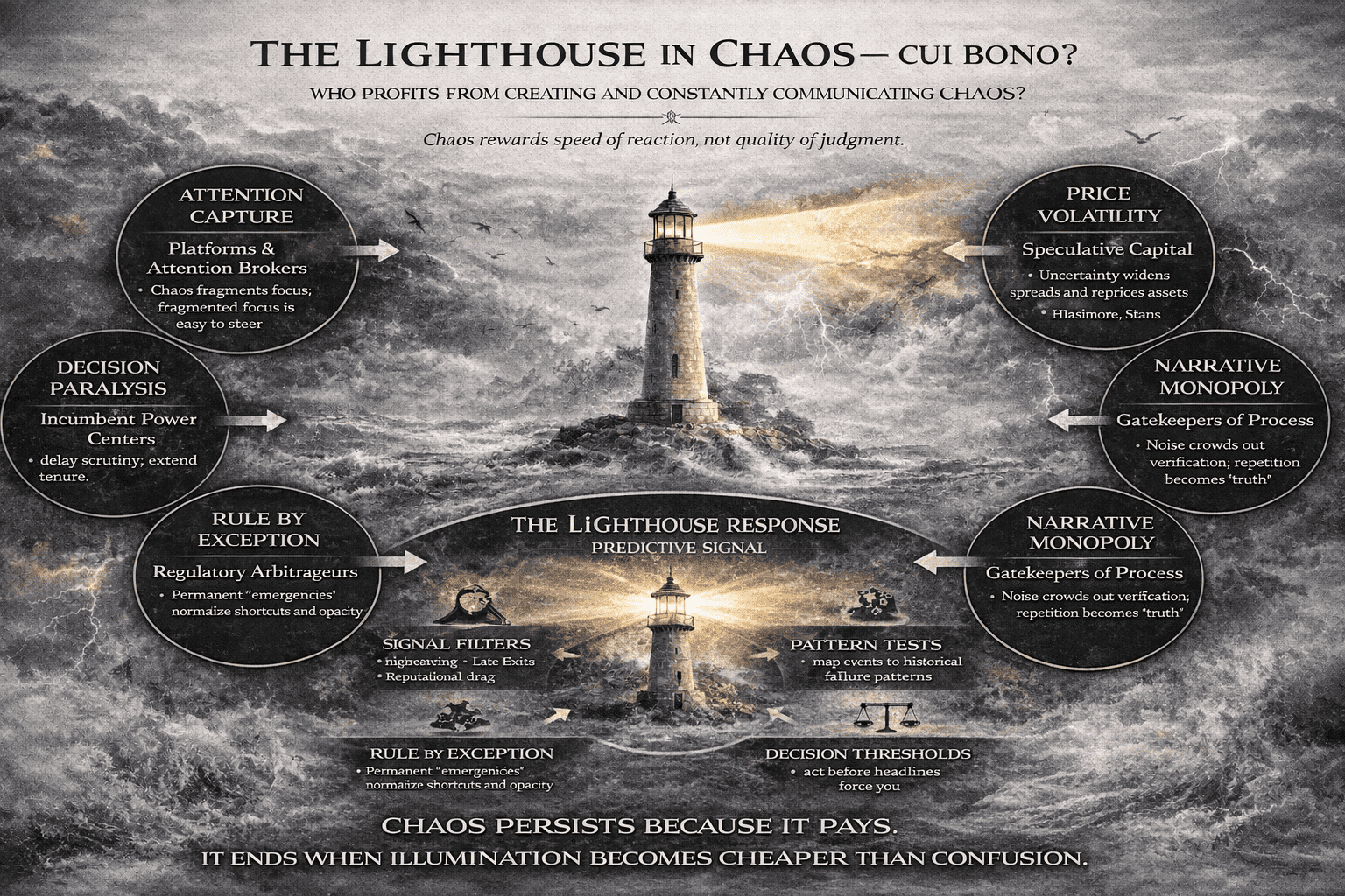 Implication: The antidote is not more information, but predictive illumination—the Lighthouse.