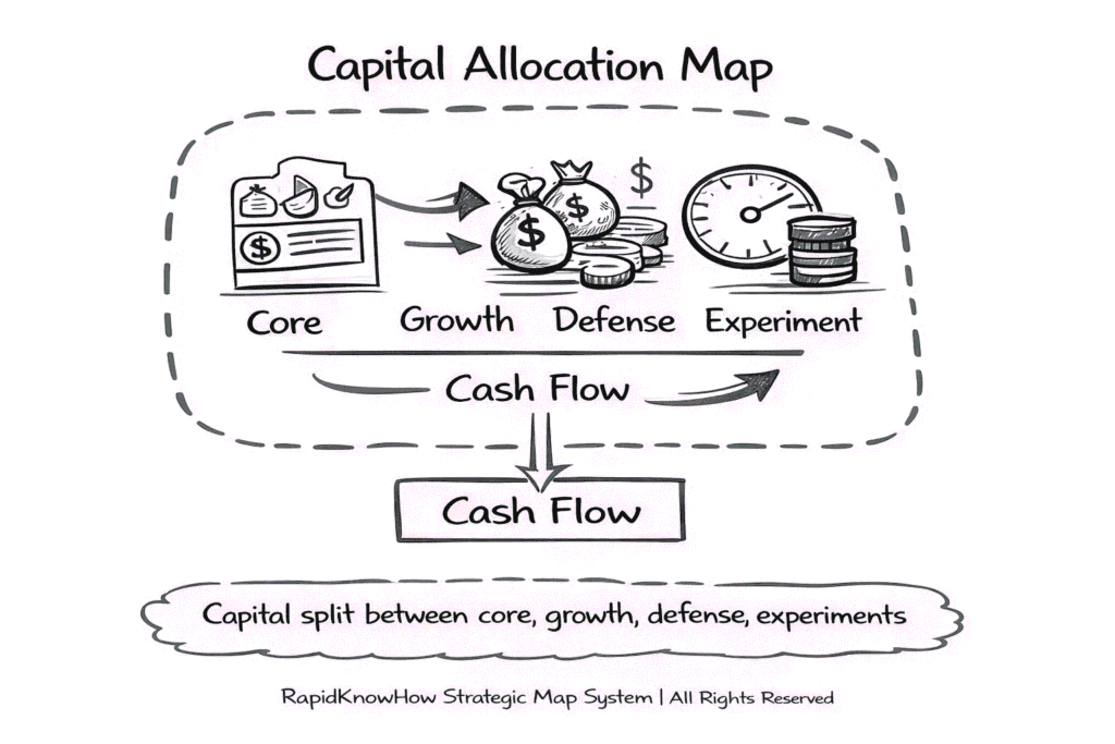 How cash is split between growth, defense, and extraction.
